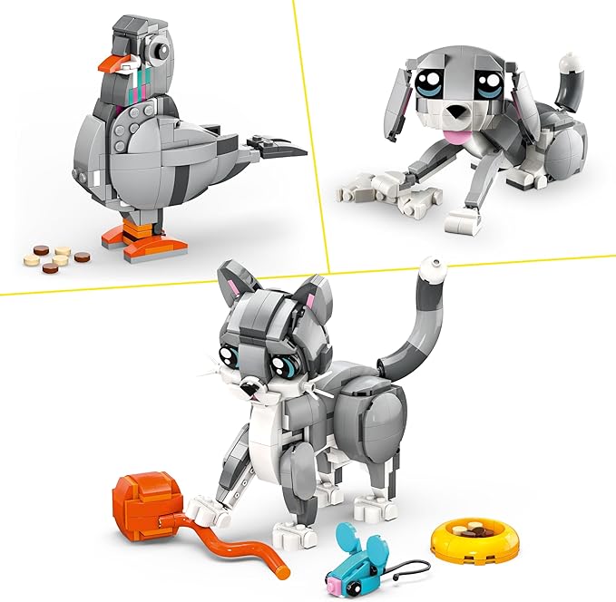 O modelo principal apresenta um Gato Brincalhão altamente articulável, capaz de mover a cabeça, orelhas, patas e cauda para sentar, ficar de pé ou simular um bote real. Para tornar a brincadeira completa, ele vem acompanhado de acessórios essenciais: uma tigela de comida, um ratinho de brinquedo e um novelo de lã. Quando chegar a hora de mudar, as peças se transformam em um Cachorro alegre com seu osso favorito ou em um Pombo curioso que adora bicar migalhas de pão.