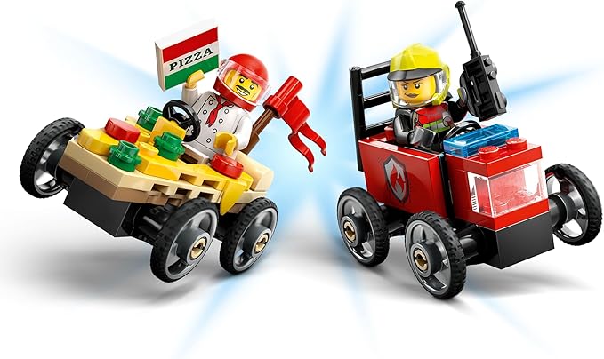 Prepare-se para a corrida mais inusitada da cidade com o LEGO City: Carro de Pizza vs. Caminhão de Bombeiros (60458)! Este conjunto criativo é o presente ideal para pequenos fãs de velocidade a partir de 5 anos, trazendo dois carros de corrida estilo "caixa de sabão" com designs hilários e cheios de personalidade.