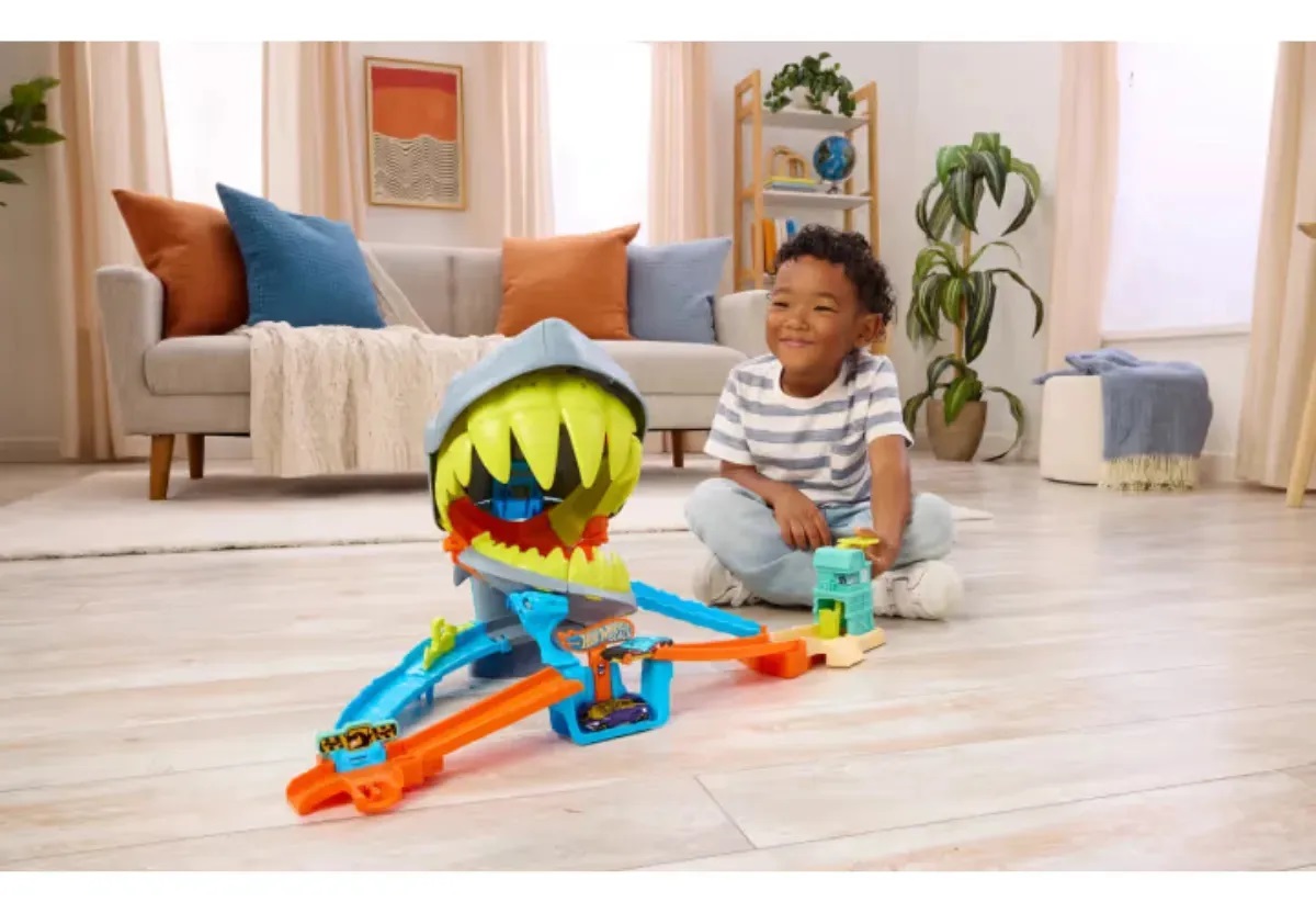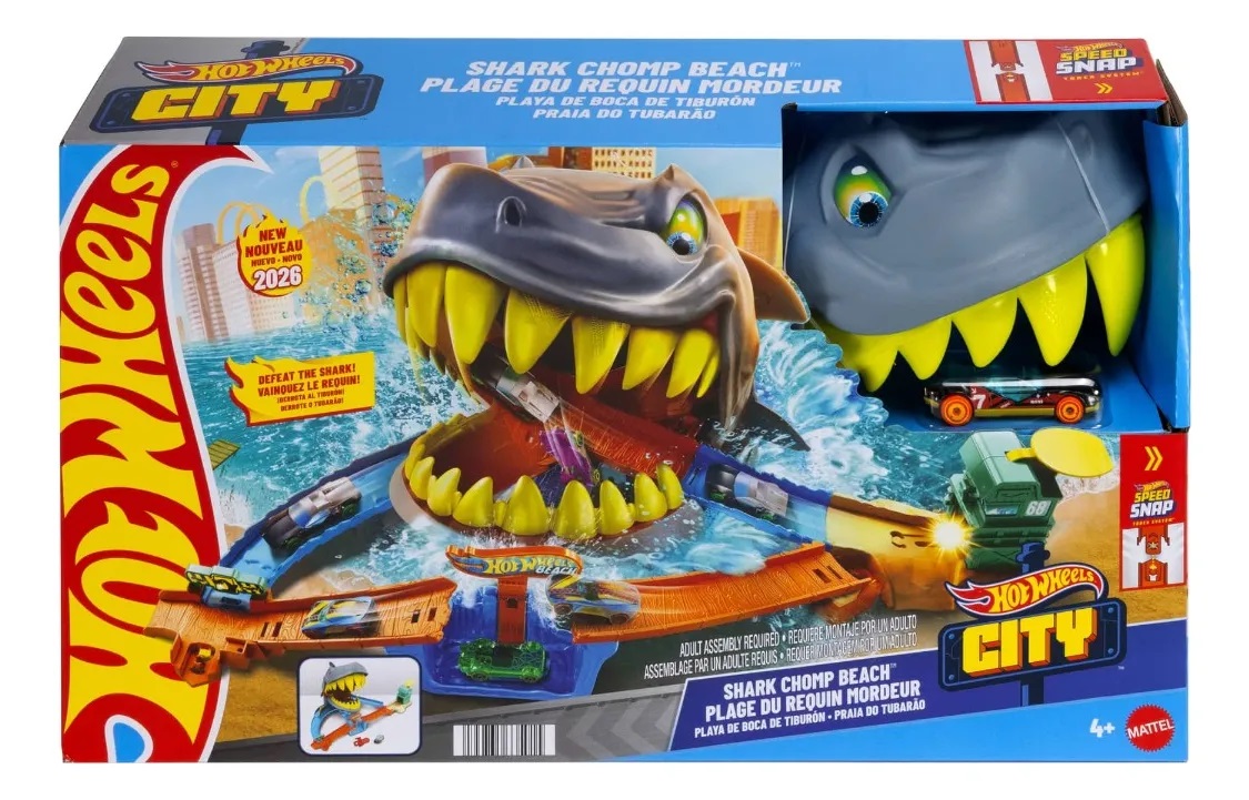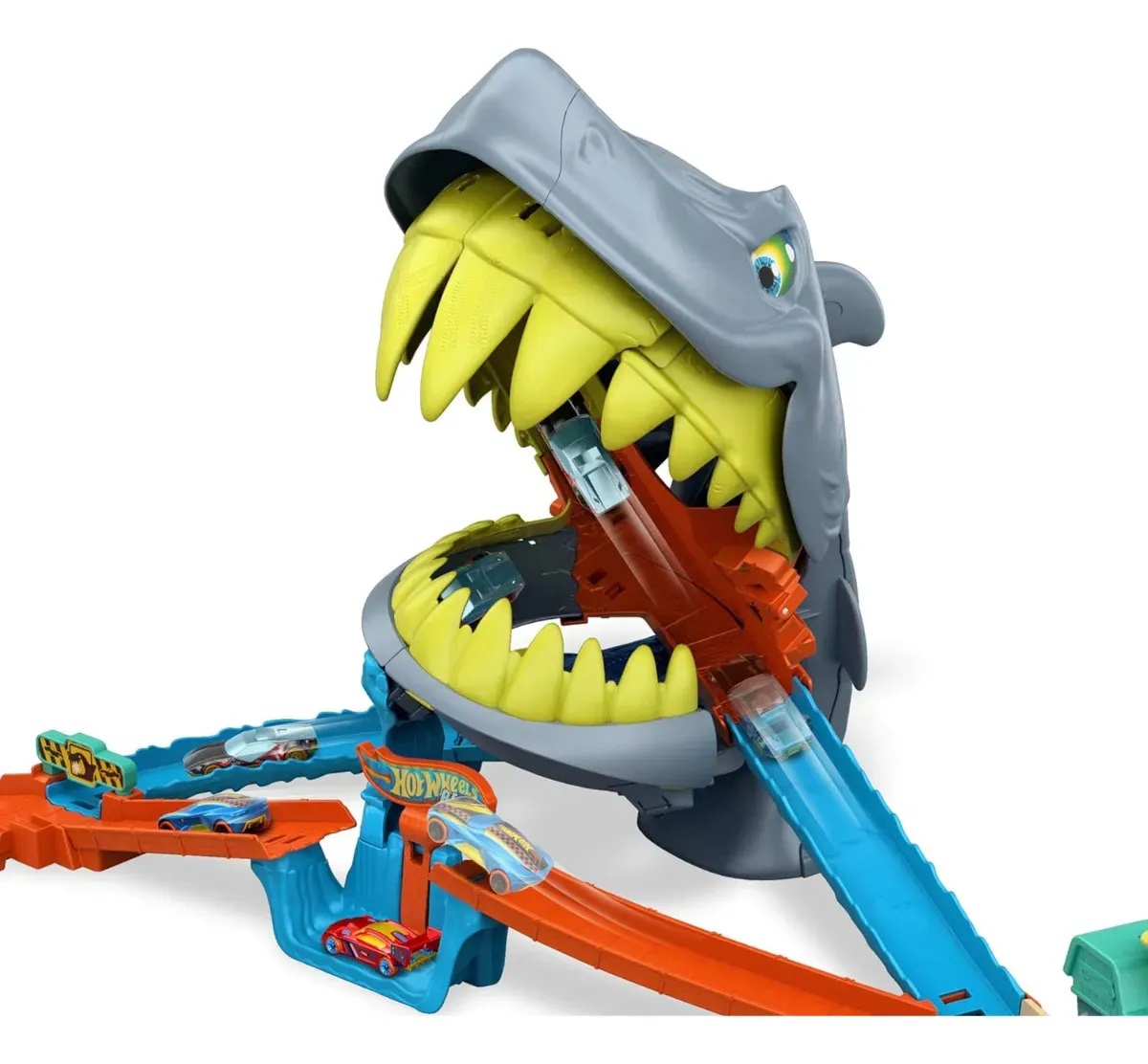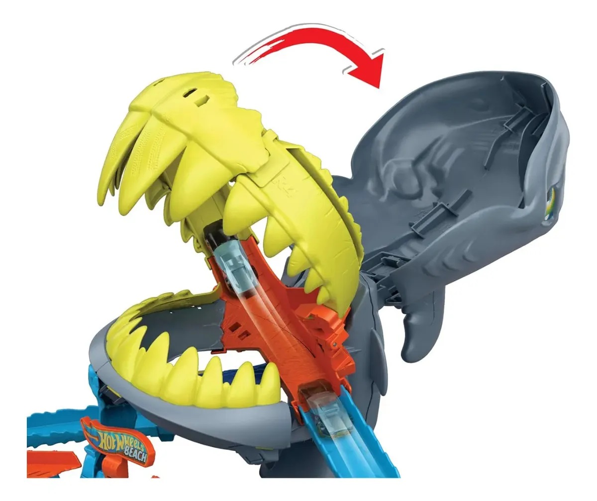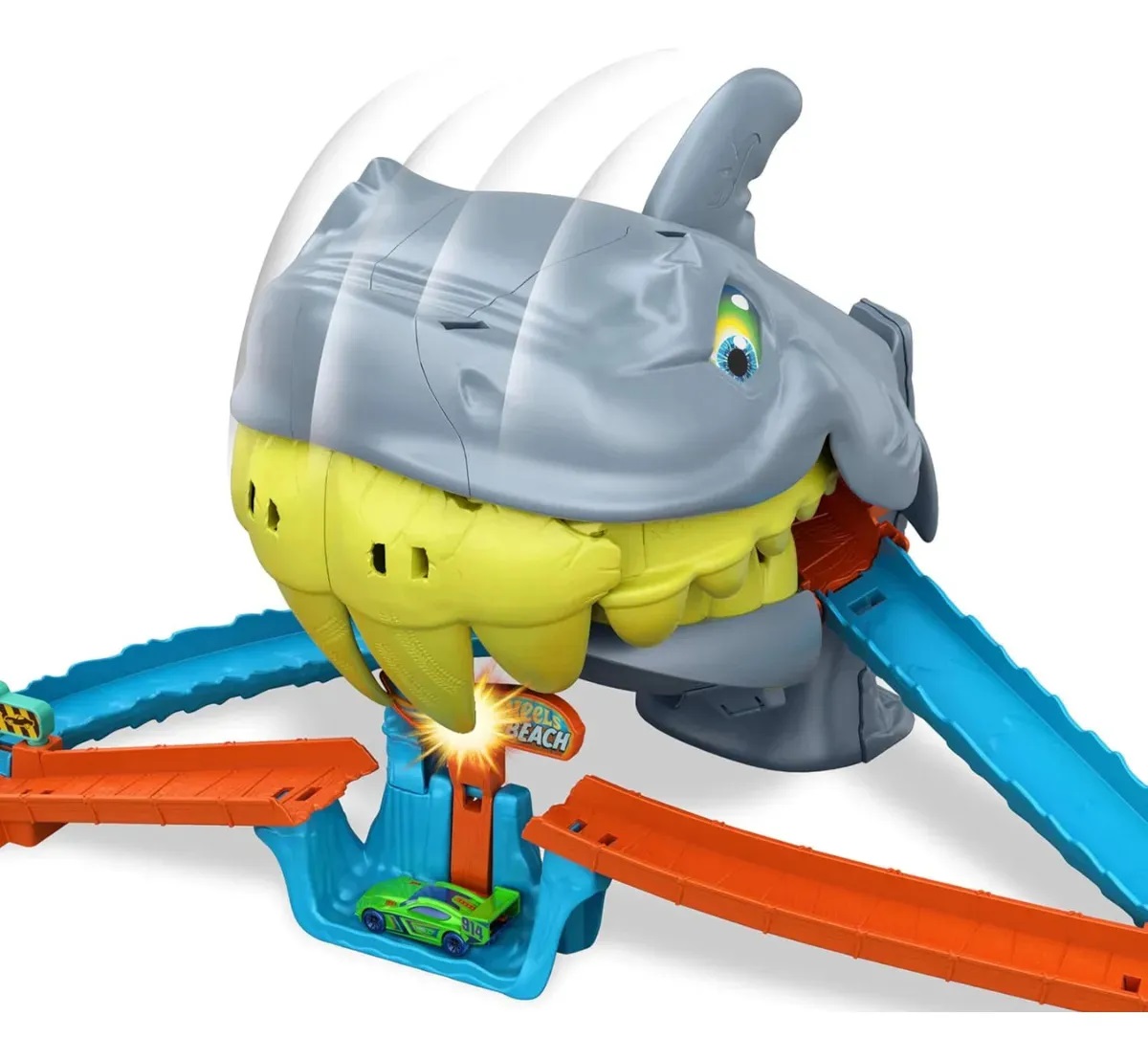 Mergulhe em uma aventura épica onde a precisão é a única forma de sobreviver às águas perigosas! No conjunto Hot Wheels City Shark Chomp Beach, os pequenos pilotos enfrentam um tubarão gigante que ameaça a paz da praia. Com um design vibrante e mecânicas de tirar o fôlego, este playset desafia as crianças a partir de 4 anos a dominarem a velocidade e a força para derrotar o predador ou acabar virando "lanche" de tubarão.